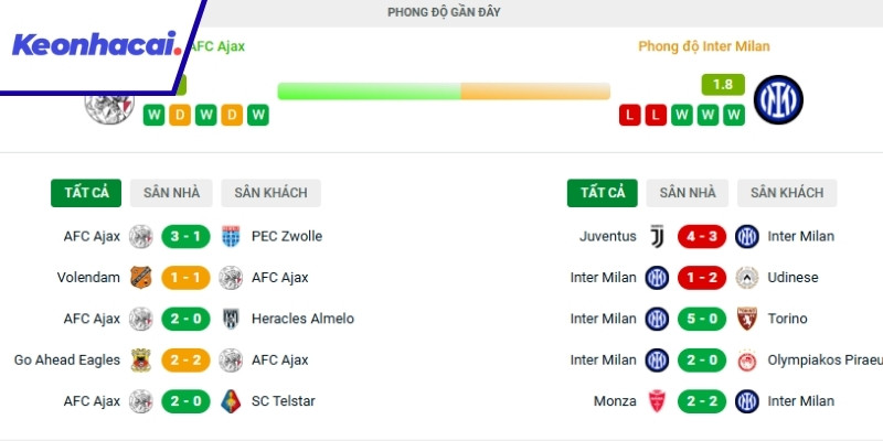 Phong độ gần đây của từng đội Ajax và Inter