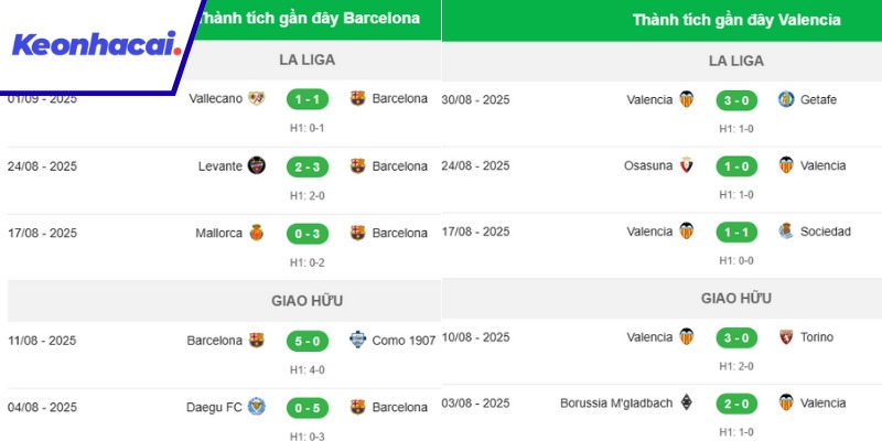 Ba trận trước đó, kết quả cũng cho thấy cán cân nghiêng về đội bóng xứ Catalonia. Barcelona duy trì mạch thắng ổn định, thường xuyên áp đảo ở khâu tấn công và thể hiện sự chắc chắn hơn hẳn trong phòng ngự. Dù Valencia vẫn có lúc tạo ra sự kháng cự quyết liệt, nhưng họ không thể duy trì được sự tập trung và bản lĩnh trong cả trận.