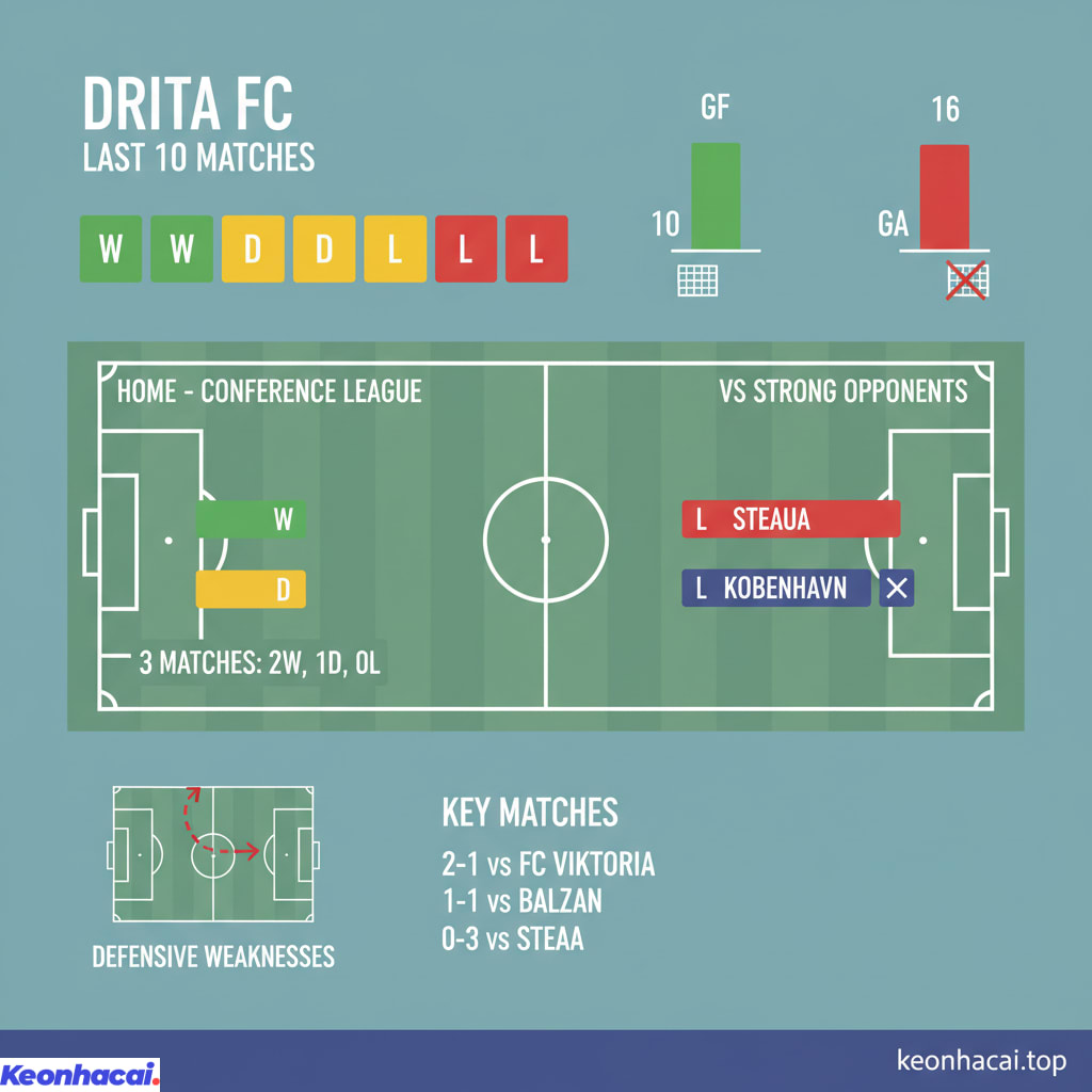 Trong 10 trận đấu gần nhất, Drita giành được 4 chiến thắng, 2 trận hòa và phải nhận 4 thất bại. Hàng công của Drita có vẻ không quá sắc bén khi chỉ ghi được 10 bàn trong 10 trận, trung bình 1 bàn/trận. Trong khi đó, hàng thủ cũng để lọt lưới 16 bàn, cho thấy sự thiếu chắc chắn. Phong độ trên sân nhà của Drita tại Conference League gần đây khá ổn định với 2 thắng, 1 hòa ở 3 trận gần nhất. Tuy nhiên, khi đối đầu với các đối thủ mạnh hơn từ Europa League hay Champions League như Steaua hay Kobenhavn, Drita đã để lộ nhiều điểm yếu và phải nhận những thất bại rõ ràng.