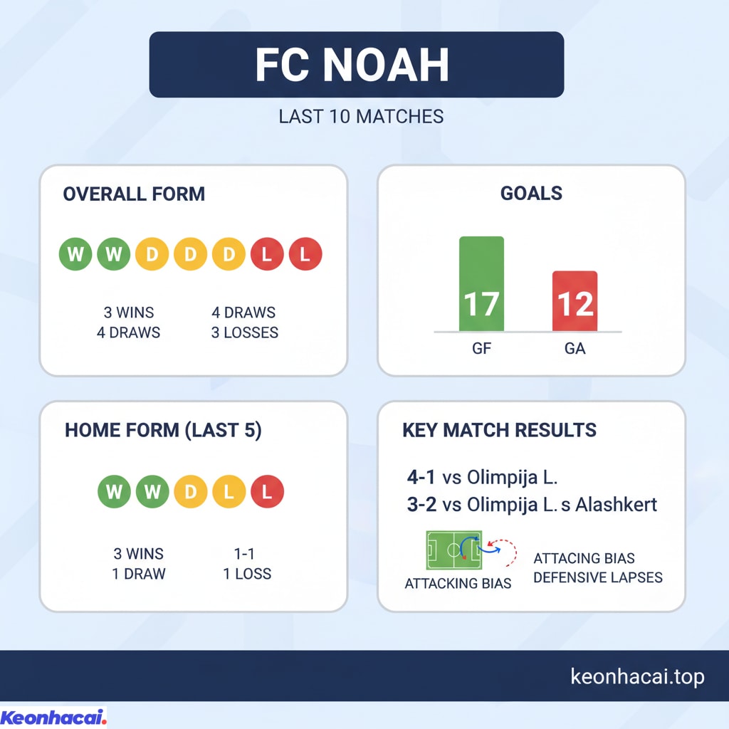 Trong 10 trận gần nhất, FC Noah giành được 3 chiến thắng, 4 trận hòa và phải nhận 3 thất bại. Đội bóng này thường có xu hướng chơi cởi mở, thể hiện qua việc ghi bàn đều đặn nhưng cũng để thủng lưới khá nhiều. Đặc biệt, phong độ trên sân nhà của FC Noah khá ấn tượng với 3 thắng, 1 hòa và chỉ 1 thua trong 5 trận gần nhất. Họ đã từng thể hiện khả năng tấn công mạnh mẽ như trận thắng 4-1 trước Olimpija Ljubljana hay 3-2 trước chính đối thủ này trên sân nhà. Tuy nhiên, hàng thủ của FC Noah đôi khi vẫn mắc sai lầm, dẫn đến những bàn thua không đáng có. Để có cái nhìn toàn diện hơn, có thể tham khảo thêm các bài Soi kèo Hacken vs AEK Larnaca để so sánh phong độ các đội bóng khác ở châu Âu.