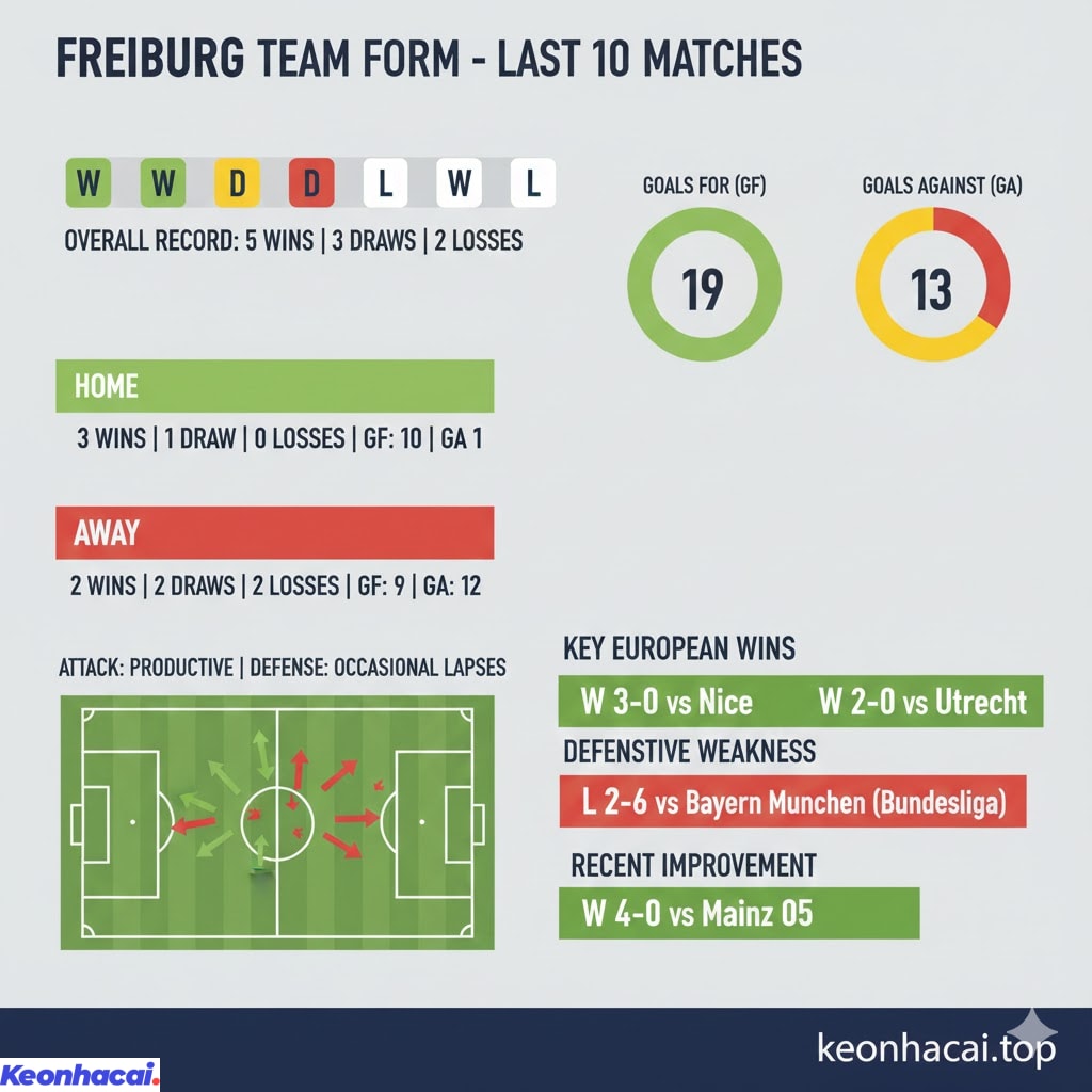 Nhìn vào bảng phong độ, có thể thấy Freiburg đã giành 5 chiến thắng, 3 trận hòa và chỉ để thua 2 trận trong 10 lần ra sân gần nhất. Đội bóng nước Đức đang có hiệu suất ghi bàn khá tốt, với 19 bàn thắng trong 10 trận. Hàng công của Freiburg thường xuyên biết cách tỏa sáng, đặc biệt là trong các trận đấu ở Europa League khi họ ghi tới 3 bàn vào lưới Nice và 2 bàn trước Utrecht.