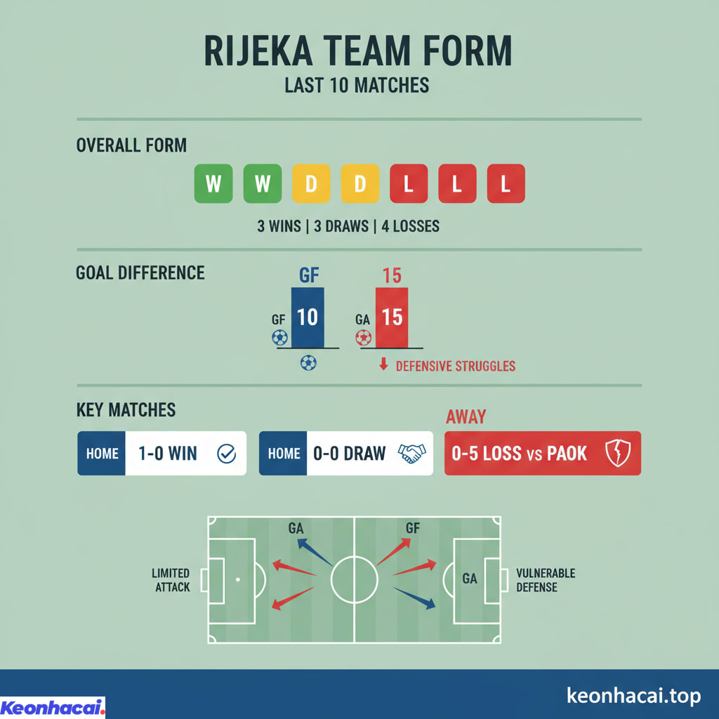 Trong 10 trận gần nhất, Rijeka chỉ giành được 3 chiến thắng, hòa 3 và để thua tới 4 trận. Hàng thủ của Rijeka thường chơi khá chắc chắn trên sân nhà, thể hiện qua các trận hòa 0-0 hay thắng 1-0. Tuy nhiên, khả năng ghi bàn của họ còn hạn chế, và khi phải đối mặt với các đối thủ mạnh hơn hoặc thi đấu xa nhà, họ dễ dàng bị áp đảo và thủng lưới nhiều. Đặc biệt, trận thua đậm 0-5 trước PAOK cho thấy hàng phòng ngự của Rijeka vẫn còn nhiều lỗ hổng cần khắc phục. Để có cái nhìn toàn diện hơn, bạn có thể tham khảo thêm các phân tích khác như Soi kèo Samsunspor vs AEK Athens.