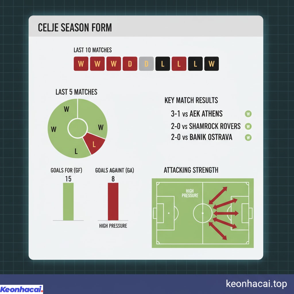 Celje đã thể hiện một phong độ rất tốt với 6 chiến thắng, 1 trận hòa và chỉ 3 trận thua trong 10 trận gần nhất. Đáng chú ý, họ thắng tới 4 trong 5 trận gần nhất, trong đó có những chiến thắng thuyết phục như 3-1 trước AEK Athens hay 2-0 trước Shamrock Rovers và Banik Ostrava ngay trên sân khách. Hàng công của Celje hoạt động rất hiệu quả, thường xuyên ghi được nhiều bàn thắng. Mặc dù vẫn có những trận để thủng lưới, nhưng nhìn chung, khả năng tạo ra đột biến và gây áp lực lên đối thủ của Celje là rất đáng nể. Nếu bạn quan tâm đến các trận đấu hấp dẫn khác, đừng bỏ lỡ bài viết Soi kèo CS Universitatea Craiova vs Sparta Praha.