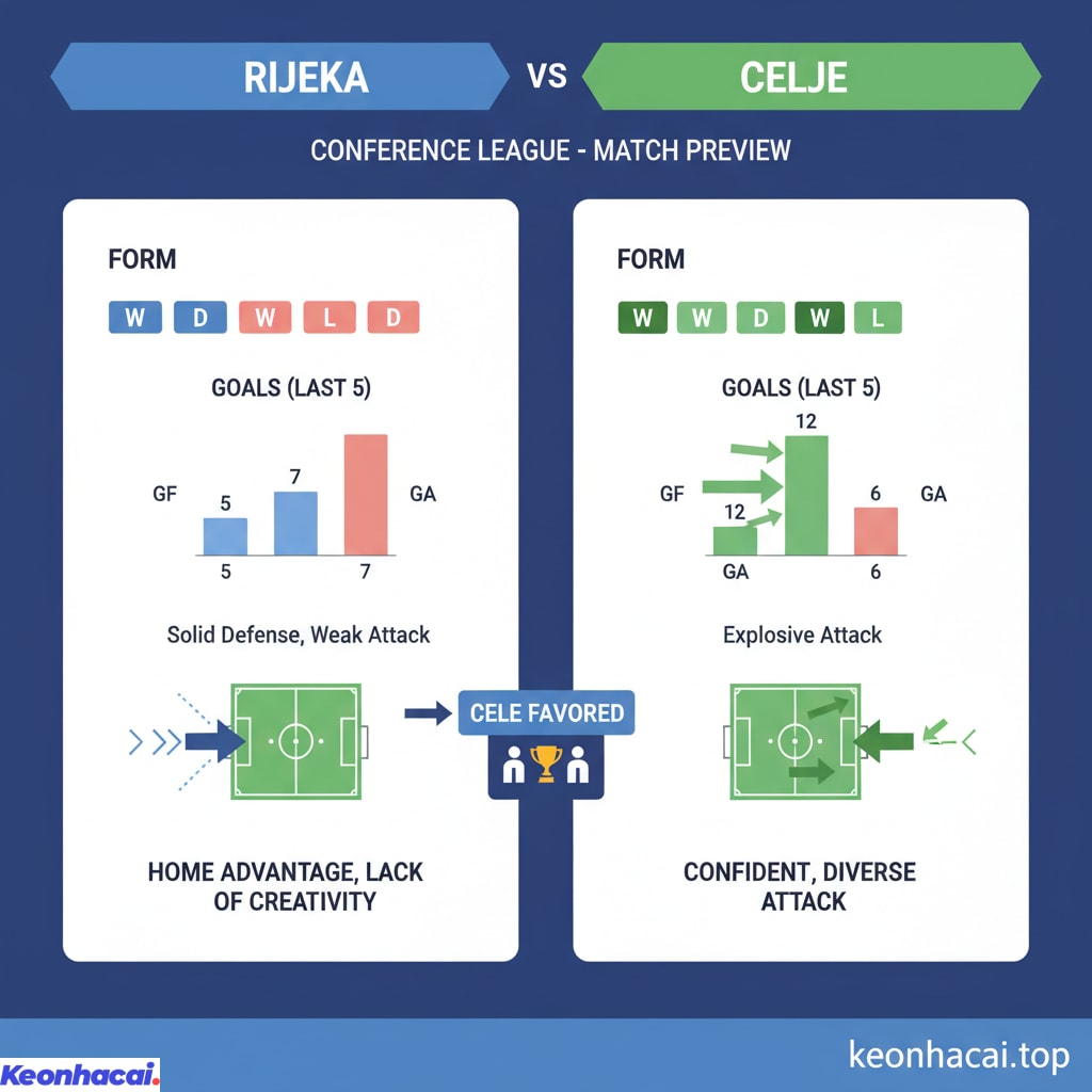 Trận đấu giữa Rijeka và Celje tại Conference League sẽ là cuộc đối đầu giữa một đội chủ nhà Rijeka có lối chơi khá chắc chắn, đặc biệt trên sân nhà, nhưng thiếu đột biến trong tấn công và một Celje đang bay cao với hàng công bùng nổ. Rijeka sẽ có lợi thế sân bãi và sự cổ vũ từ khán giả nhà, điều này có thể giúp họ duy trì sự ổn định trong phòng ngự. Tuy nhiên, khả năng ghi bàn của họ vẫn là một vấn đề.