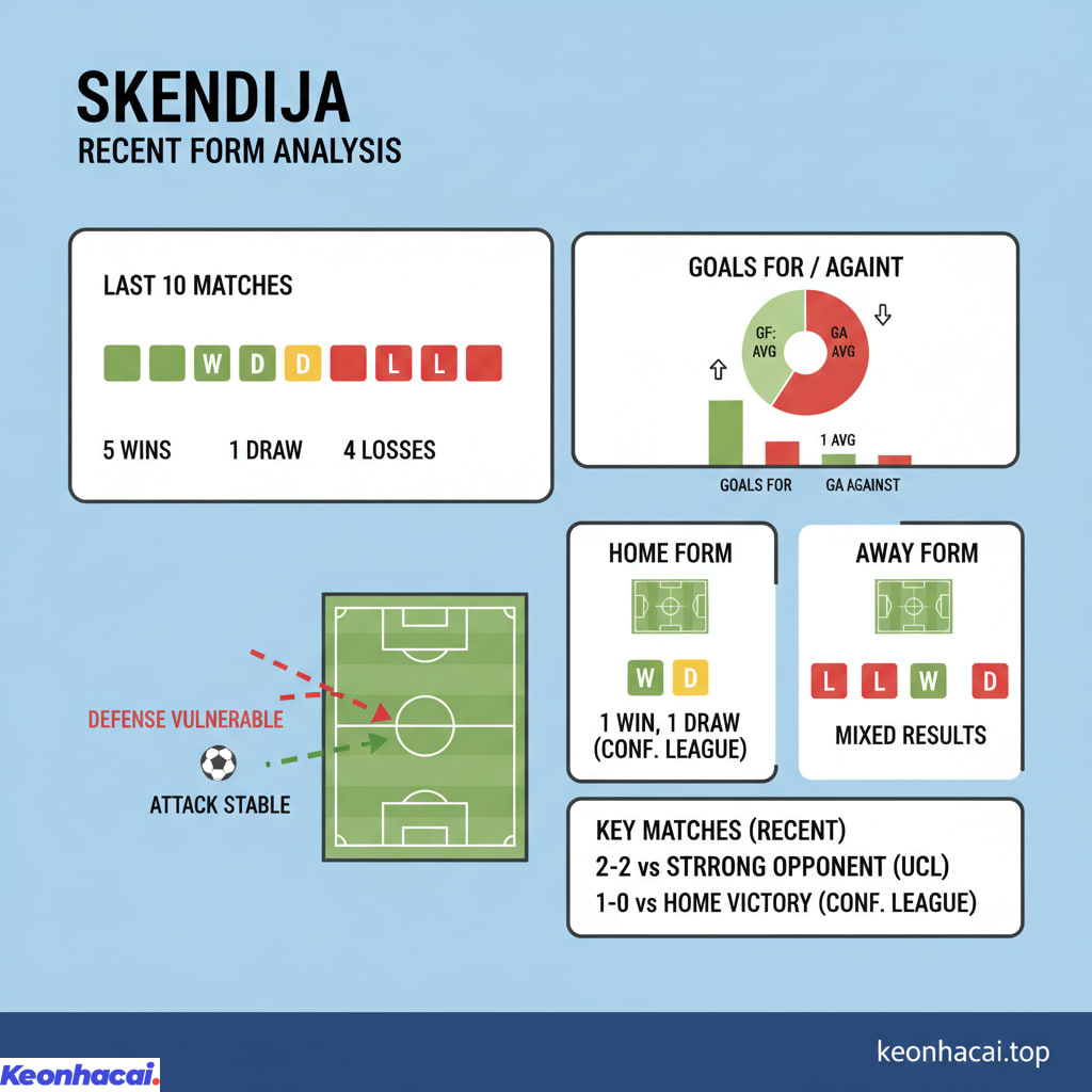 Nhìn vào chuỗi 10 trận gần nhất, Skendija có 5 chiến thắng, 1 trận hòa và để thua 4 trận. Mặc dù thắng nhiều hơn thua, nhưng những thất bại thường đến trước các đối thủ mạnh hơn ở các giải đấu cấp cao như Europa League hay Champions League với tỷ số cách biệt. Tuy nhiên, khi trở về Conference League, họ thể hiện tốt hơn trên sân nhà với 1 trận thắng và 1 trận hòa gần đây. Khả năng ghi bàn của Skendija khá ổn định ở mức trung bình, nhưng hàng thủ đôi khi vẫn tỏ ra lỏng lẻo khi đối mặt với áp lực lớn.