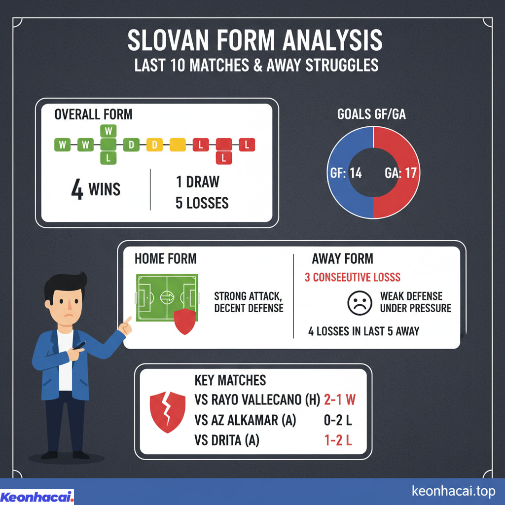 Đội khách Slovan cũng cho thấy một bức tranh phong độ không mấy ổn định, đặc biệt là khi phải làm khách.